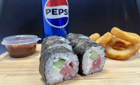 Рис, сыр, курица, ананас кос., соус Самурай, нори + соевый соус